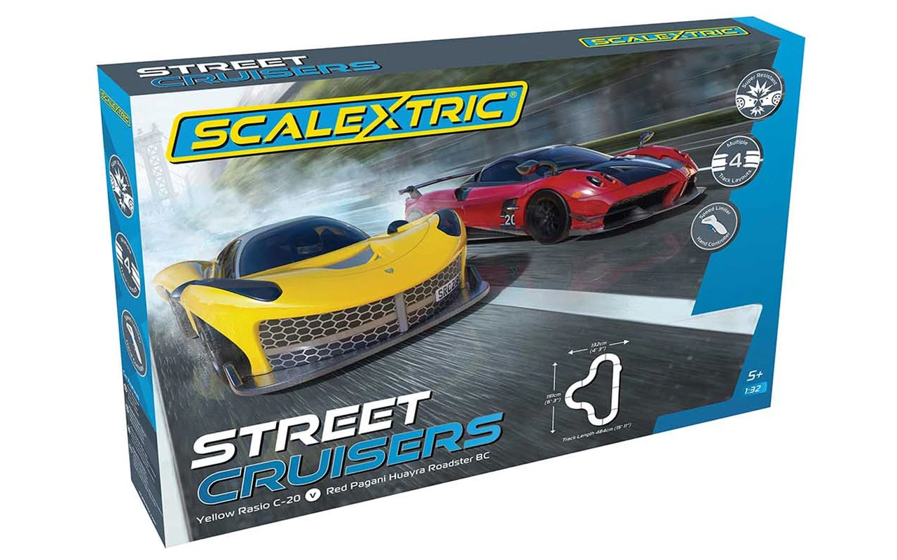 This is the Scalextric Street Cruisers 1/32 Slot Car Track Race Set. The Scalextric Rasio takes on the elegant Pagani Huayra Roadster BC in this Street Cruisers race set. This set features everything you need to start your racing career, including: 2 easy speed limiting hand controllers, 2 crash resistant cars and over 4.8 meters of track which creates 4 track layouts.