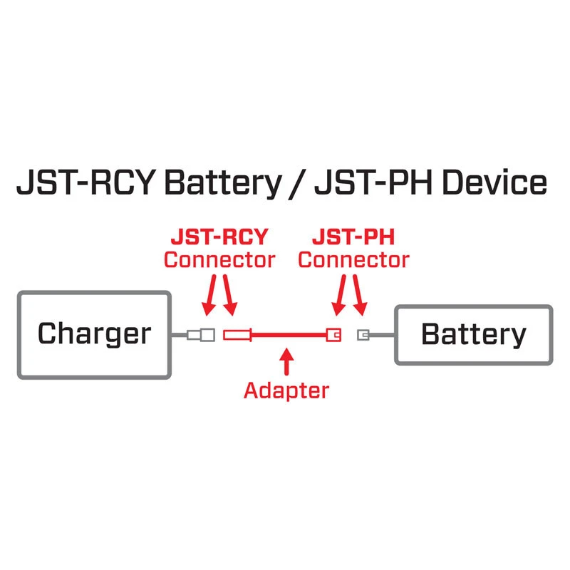 - Adapts PH/UMX connector 2S 7.4v LiPo batteries to common “Red JST” JST-RCY Battery Connector