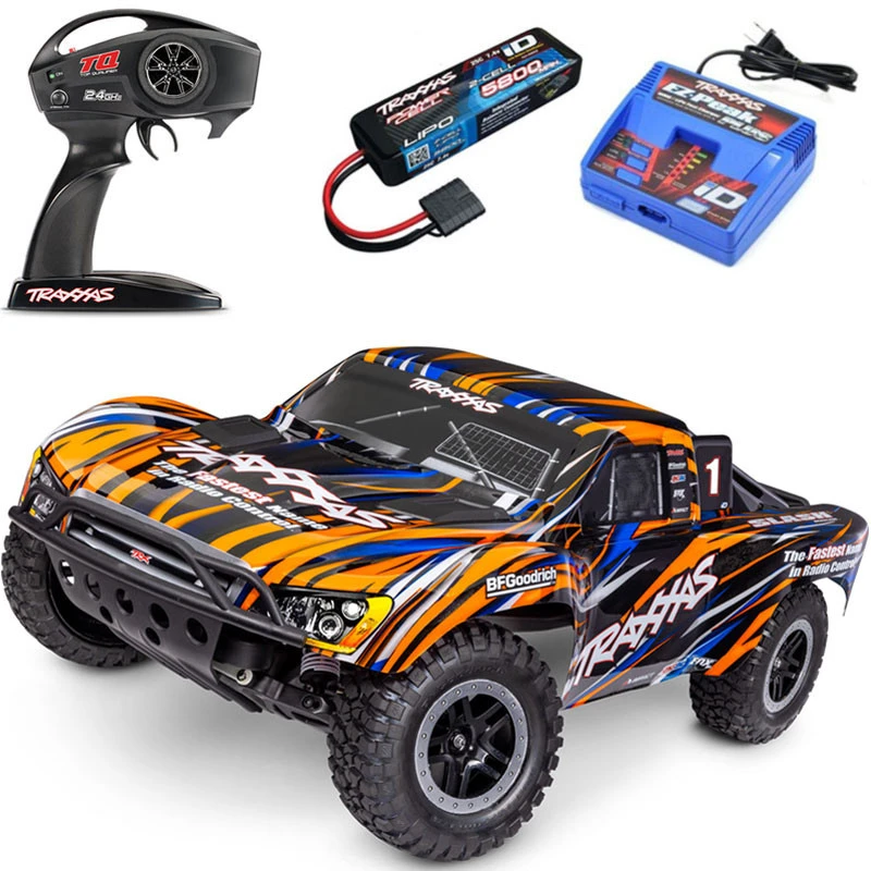 This is the Traxxas Slash 2WD BL-2s 1/10 Scale Short-Course Ready-to-Race Truck 2S Lipo Combo with 5800mAh 2S LiPo and EZ-Peak ID Charger. This truck comes fully assembled and Ready-To-Race, with the Traxxas TQ 2.4GHz radio system, BL-2s brushless power system, and clipless painted body.