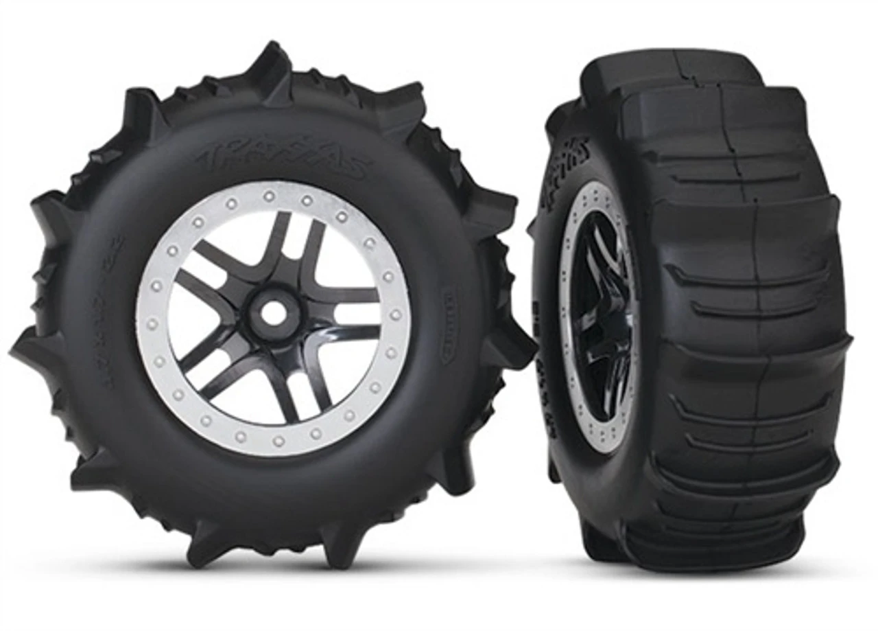 Tires & wheels, assembled, glued (SCT Split-Spoke black, satin chrome beadlock style wheels, paddle tires, foam inserts) (2) (4WD f/r, 2WD rear) (TSM rated)